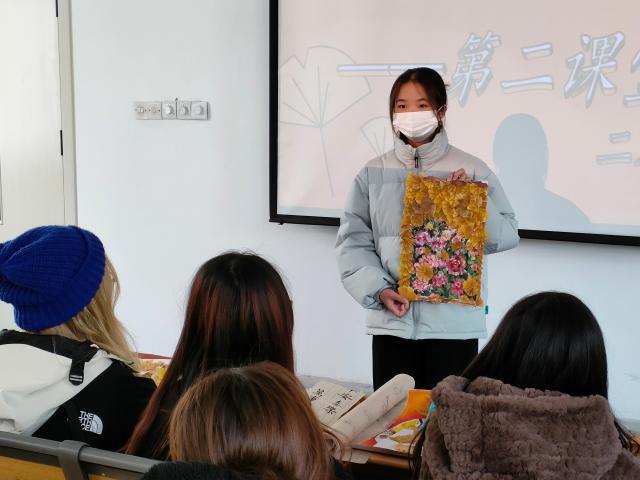 文字暖心,落叶传情。同学们走遍校园的各个角落,找寻自己眼里中最美的落叶,以落叶作为载体,开动想象力,创作出形式各异的作品。展厅中,同学们依次上台,自信地向大家展示自己的作品,用最朴实真诚的话语讲述自己的创作灵感、分享自己的创作过程,说明自己在其中寄托的情感。活动作品类型多样,书法、绘画、手工制作一应俱全,一件件趣味非凡的落叶作品不仅展现了同学们无限的创意,更是表现出了别致的创新思路。落叶虽小,却承载着属于自己的温暖与美好,五彩缤纷的设计也为这个秋天增添了一分暖意。活动后期,负责人清理了余下的树叶和废纸,打扫好教室的卫生。同学们手持自己的作品进行合照留念。