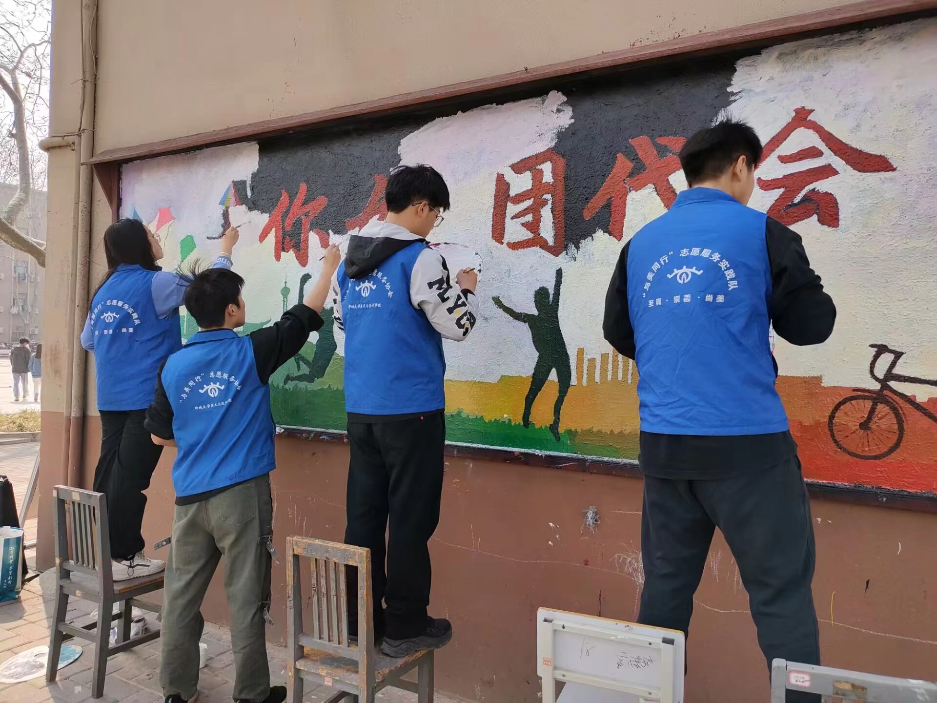 午后阳光明媚,春风和煦,志愿者们来到板绘场地整理画材,清理墙面。活动中,志愿者们以提前准备好的绘画素材为模板,分组合作,相互配合,先用粉笔进行起型,再用画笔板刷上色。板报用深红色描摹出主题字,用青绿色和红橙色勾勒出颜色渐变的剪影图案。远远望去,如漫山红遍,层林尽染,在春天刚刚迫近的脚步中,给校园带来一丝生机勃勃的明媚色彩。经过一下午的忙碌,一幅崭新的画卷展现出来,散发着青春的活力和未来的期望。路过的老师同学纷纷驻足观看,志愿者们热情地介绍起板报的设计思路。板绘结束后,为维护美丽校园环境,志愿者们将活动现场收拾干净。