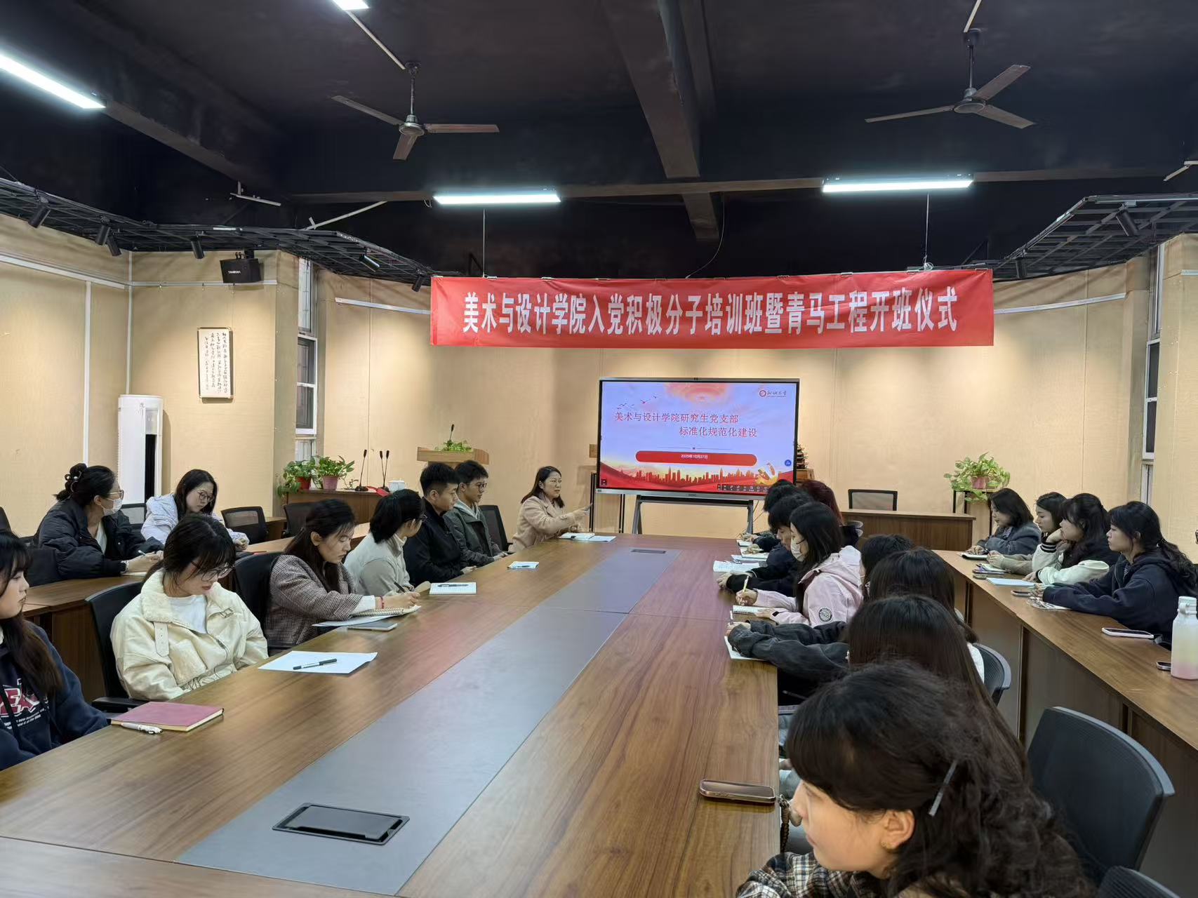 会议伊始,许中美向全体党员系统梳理了研究生党支部的发展历程,从支部成立初期的组织架构搭建,到近年来在“党建+专业”融合模式下的特色实践,通过图文结合的方式,回顾了支部在理论学习、主题活动、服务师生等方面的关键节点,让全体党员尤其是研一新报到的学生党员感知支部的成长脉络与责任传承。会议重点总结了支部开展“思政年历”微视图、微视频活动一年来的工作成绩及不足,针对“思政年历”视频与海报的质量问题,进一步明确要求,规范质量标准,强调全体党员结合专业优势认真对待,确保这项活动既显红色温度,又具专业质感,用美术与设计的力量讲好党建故事。参会党员纷纷表示今后将主动对标会议提出的规范要求,在学习工作中积极发挥先锋模范作用,推动支部党建与专业发展深度融合。