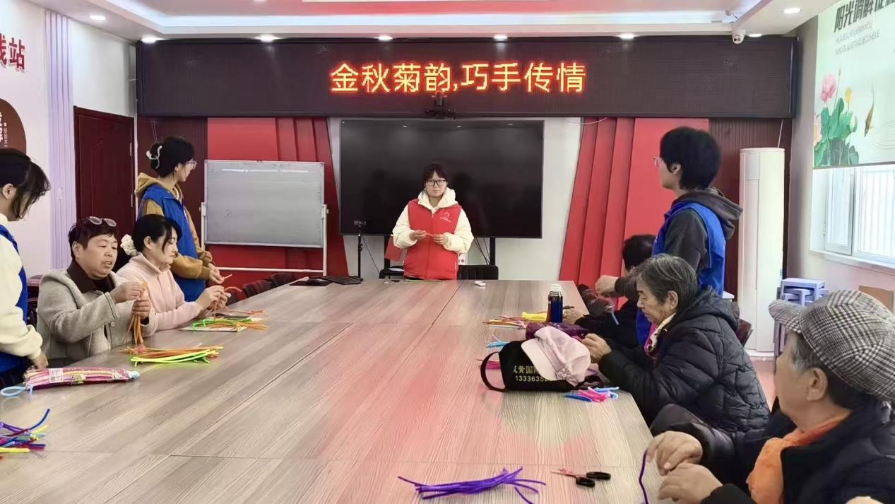 活动伊始,志愿者们为老人们细心分发扭扭棒、剪刀、铁丝等制作材料,随后由志愿者现场演示扭扭棒菊花的制作步骤,从花瓣的缠绕、花茎的固定到叶片的搭配,每一个细节都讲解得耐心细致。老人们认真倾听,纷纷拿起材料动手尝试,遇到缠绕不规整、造型难把握的问题时,志愿者们便俯身手把手指导,调整花瓣弧度、协助固定花型,现场充满欢声笑语。在一双双巧手下,原本普通的彩色扭扭棒渐渐蜕变出形态各异的菊花,在老人们手中绽放出别样生机。看着自己亲手制作的作品,老人们脸上洋溢着成就感与喜悦,互相展示、交流心得,分享创作的快乐。活动最后,大家拿着亲手制作的扭扭棒菊花合影留念,定格下这温馨美好的瞬间,为本次活动画上圆满句号。